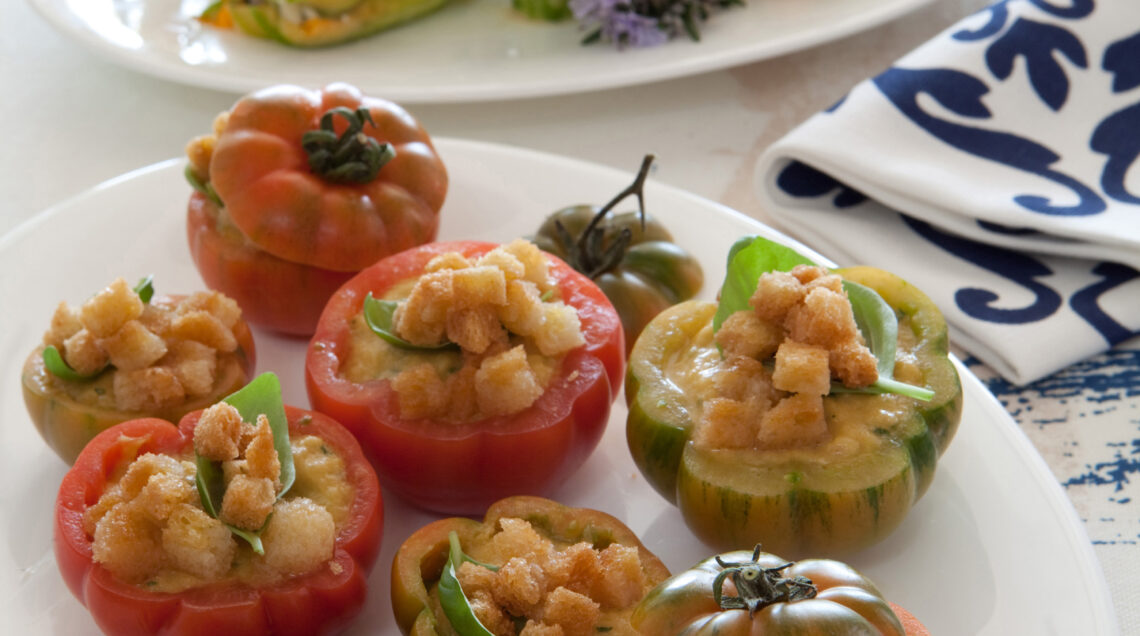 2) Taglia il pane a dadini e falli rosolare in padella con un filo d'olio. Farcisci i pomodorini con il gazpacho preparato, completa con i crostini di pane e servili accompagnati dai fiori di zucca farciti.