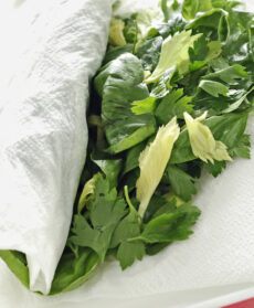 Lavate le foglie di prezzemolo, 10-12 foglie di basilico e le foglioline del sedano. Sgocciolatele e fatele asciugare su più strati di carta da cucina. Arrotolate la carta sulle foglie e tamponatele delicatamente.