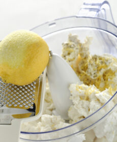 Riunite nel mixer i formaggi, le erbe aromatiche, 1 spicchio d'aglio sbucciato e tagliato a pezzetti, 5-6 cucchiai di olio, la scorza grattugiata di 1/2 limone e tutto il succo, un pizzico di sale e una macinata di pepe. Frullate gli ingredienti, in modo da ottenere un composto ben amalgamato e omogeneo.