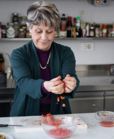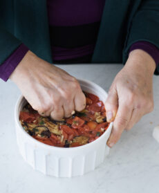 Disponete le melanzane, a strati, in un recipiente a bordi alti, alternando ogni strato con 1-2 cucchiai di pomodori (a cui avrete aggiunto, se necessario, il succo raccolto), e foglie di menta spezzettate. Terminate con uno strato di melanzane, condite ancora con un filo di olio e premete bene il tutto con una mano. Lasciate riposare per almeno un'ora.