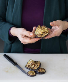 Tagliate le melanzane a fette rotonde spesse circa 1/2 cm e cuocetele su una griglia ben calda ungendole con un filo di olio; lasciatele dorare da ambedue le parti, poi appoggiatele su un piatto a raffreddare. Praticate sulla buccia, tutt'intorno, 4 incisioni a distanza regolare, poi "sfrangiate" le melanzane, ossia schiacciatele leggermente con le dita.