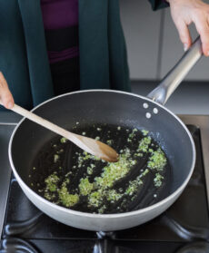 Preparate la tuma: tritate la cipolla e fatela soffriggere in una padella antiaderente con 2 cucchiai di olio.
