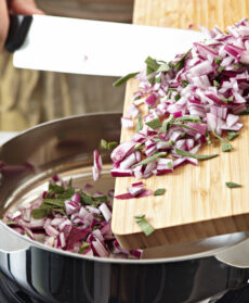 Sbuccia la cipolla e tritala finemente insieme alla salvia. Trasferisci il trito in un tegame, copri d’acqua e lascia ritirare a fuoco medio.