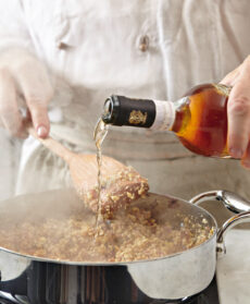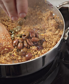 Aggiungi l’okara tritato finemente e cuoci per 10 minuti. Bagna con la salsa shoyu e dopo un paio di minuti unisci 1 bicchiere di vin santo.