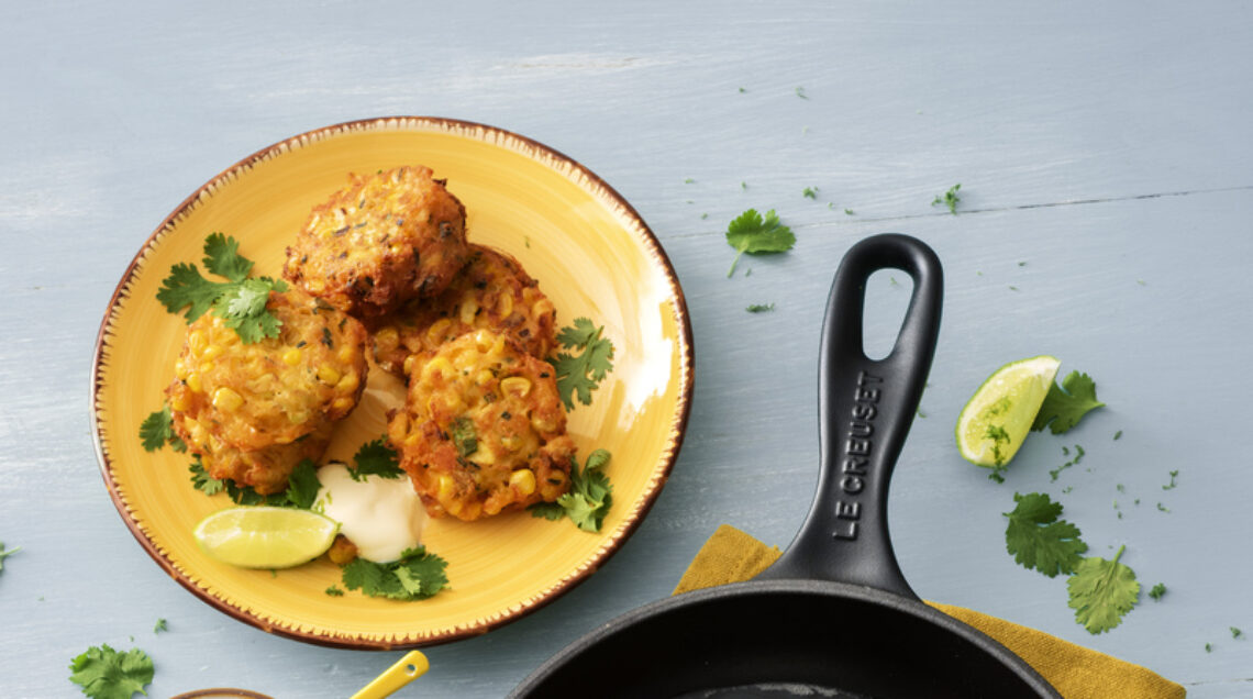 1 Mescolate la panna acida con il succo e la scorza del lime, unite qualche foglia di coriandolo tagliuzzata grossolanamente e conservatela al fresco. Sgranate le pannocchie e raccogliete i chicchi in una ciotola (dovrete ottenere circa 460-470 g di chicchi). Mondate i cipollotti e tagliateli a rondelle. Unitele ai chicchi di mais con l'erba cipollina, la farina, il formaggio, le uova, sale e pepe.