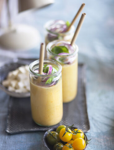 1 Private dei semi 450 g di polpa di anguria; lavate 3 pomodori, tagliateli e privateli dei semi; sbucciate 1 cetriolo e tagliatelo a fette; lavate 1 peperone rosso, privatelo dei semi e dei filamenti bianchi e tagliatelo a pezzi; lavate una manciata di foglie di basilico; lavate 2 gambi di sedano; sbucciate un pezzetto di zenzero di 1 cm.