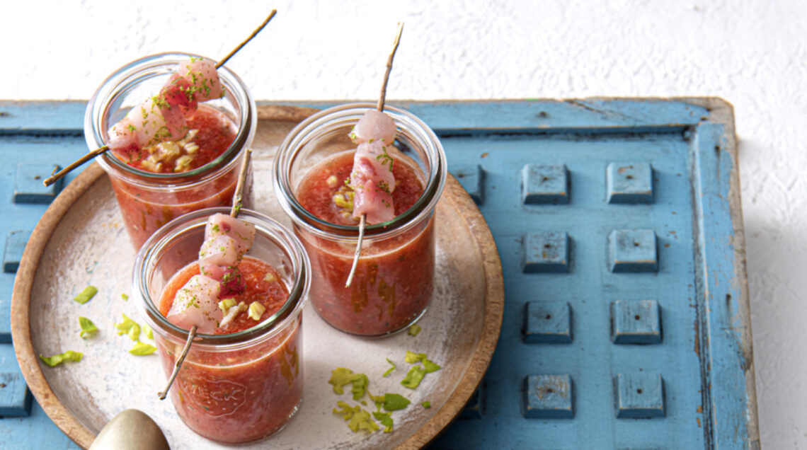 Il gazpacho di anguria con spiedini di pesce spada è l'antipasto ideale per iniziare un pasto con il piede giusto. Ricetta particolarmente adatta per l'estate, il suo abbinamento ricercato vi permetterà di fare sicuramente colpo sui vostri ospiti.