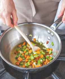 Mondate la cipolla, la carota e il sedano, tagliateli a pezzetti e fateli soffriggere per un paio di minuti in una padella con qualche cucchiaio d'olio insieme al peperoncino.