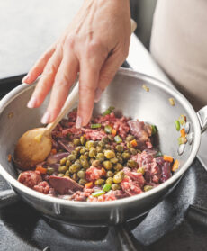 Tagliate a dadini 50 g di pane, bagnatelo nell'aceto e unitelo alla carne senza strizzarlo continuando a cuocere per altri 10-15 minuti. In un padellino fate soffriggere le foglie di salvia e una manciatina di aghi di rosmarino in 3 cucchiai d'olio. Togliete gli aromi e versate l'olio aromatizzato nel mix di carne preparato; passate tutto con il passaverdure.