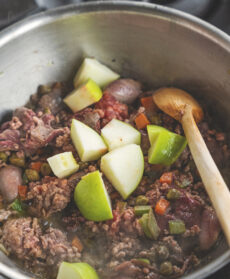 Unite la mela non sbucciata e tagliata a tocchetti e un ciuffetto di prezzemolo tritato. Lasciate insaporire qualche minuto mescolando, quindi versate poca acqua bollente e lasciate cuocere per un'ora e mezza mescolando ogni tanto e unendo altra acqua calda quando occorre.