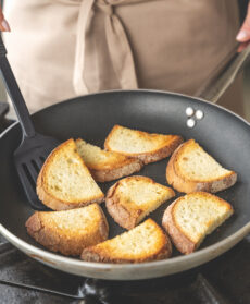 Tagliate altro pane a fettine e tostatele in una padella antiaderente. Servite il paté caldo con le fettine di pane e uno spicchio di limone per spremerne qualche goccia su ogni tartina; guarnite, se vi piace, con dadini di mela verde.