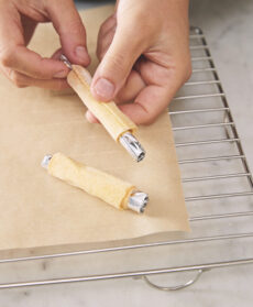 Ricavate tante palline di impasto da 20 g cadauna e stendetele sottili. Avvolgete le sfoglie intorno a cannoli d'acciaio mignon e cuocetele in forno statico a 170° per 12 minuti. Lasciate raffreddare prima di estrarre gli stampi.