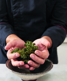 Fate la crema verde. Essiccate le foglie di cavolo riccio in forno ventilato a 150° per 30 minuti e sbriciolatele in una ciotolina.