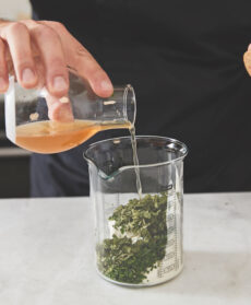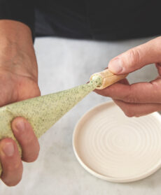 Riunite in un bicchiere la crème fraîche, l'erba cipollina tagliuzzata, le foglie di cavolo essiccate, un cucchiaino d'olio e uno di aceto di mele. Frullate, inserite la crema in una sac-à-poche e mettete in frigo.