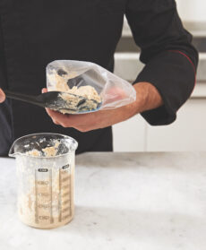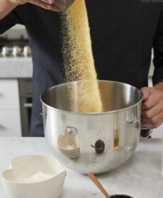 Fate i cannoli. Unite nella planetaria 80 g farina di mais, la curcuma e 110 ml d'acqua a 26°. Impastate e lasciate riposare per 30 minuti, quindi unite la farina 0, 40 ml di olio, 5 g di sale e il lievito sbriciolato. Impastate ancora fino a ottenere una pasta liscia. Coprite con la pellicola e lasciate riposare per 2 ore.