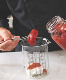 Fate la crema rossa. Montate la panna. Frullate la ricotta, il pomodoro, 1 cucchiaino di olio, l'aglio, la paprica e l'amido. Unite la panna e inserite in una sac-à-poche.