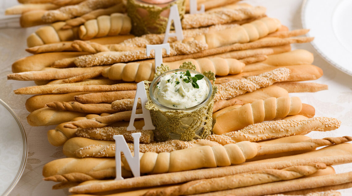 3) A questo punto disponi i due bicchieri con le mousse su un grosso vassoio rettangolare, poi metti intorno i grissini assortiti partendo da quelli più grossi e lunghi fino a quelli più piccoli. Quando avrai creato una composizione abbastanza armoniosa, completa il tutto con le lettere di cartoncino bianco con la scritta Natale e posiziona il tuo centrotavola.