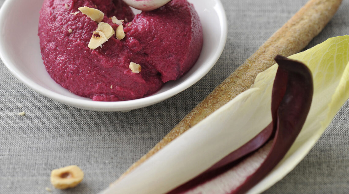 3 Eliminate le radici dei cespi di belga e di radicchio, sfogliateli, lavateli e asciugateli. Distribuite la mousse di barbabietole preparata in 4 ciotoline e decorate con le nocciole tenute da parte.