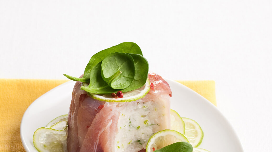 5) Versa la spuma di scorfano e spada al lime negli stampini e ripiegaci sopra le fettine di spada. Lasciala riposare in frigo per circa 3 ore in modo da raffreddarla completamente e decorala, prima di servirla e dopo averla sformata, con bacche di pepe rosa, foglioline di spinaci e fettine di lime.