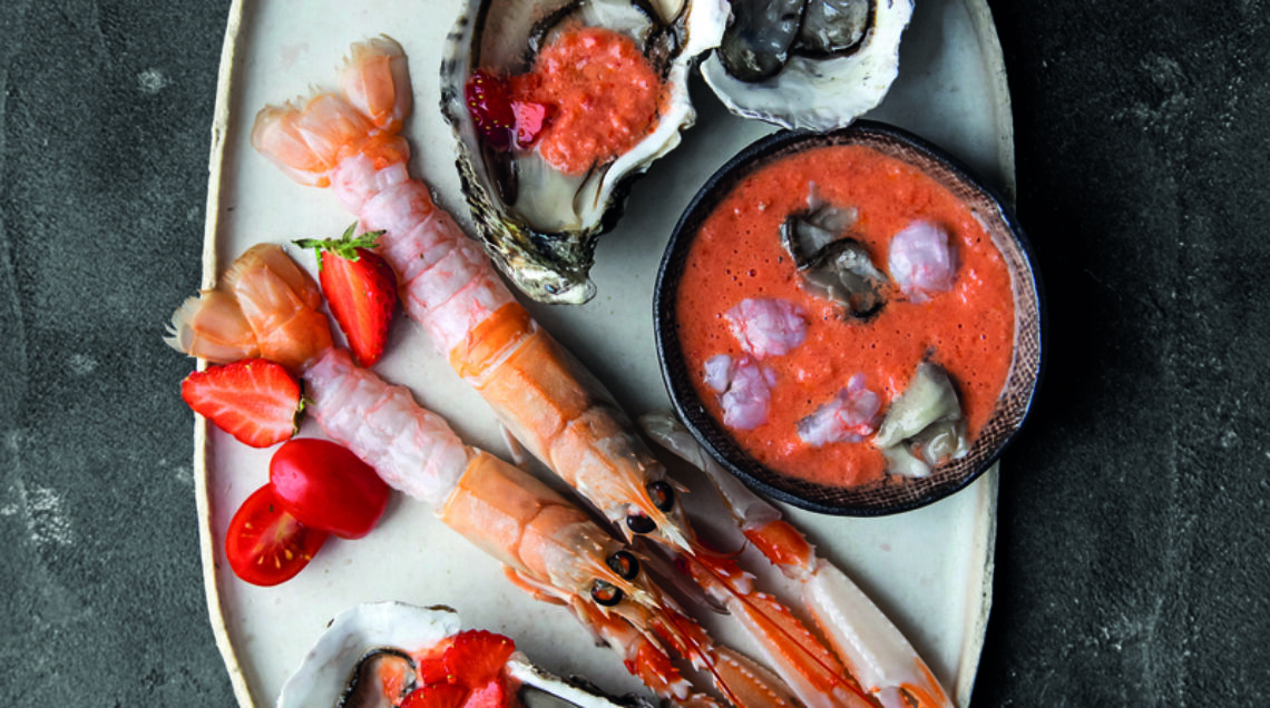 Una proposta creativa e raffinata, a base di crostacei e fragole. Con l'aroma del cipollotto e la dolcezza della frutta