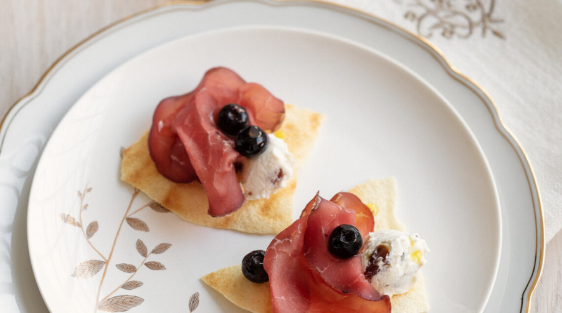 In questo caso abbiamo deciso di proporvi questi stuzzichini realizzati con pane carasau, formaggio ai datteri, bresaola di chianina e mirtilli: un'esplosione di sapori che conquisterà i vostri ospiti.