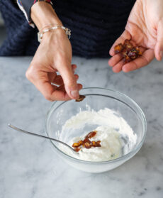 Preparate la crema di formaggio. Private i datteri dei noccioli e tagliateli a fettine sottili. In una ciotola mescolate il formaggio con la panna, una macinata di pepe, qualche fogliolina di timo e i datteri preparati. Amalgamate bene il composto e tenete da parte.
