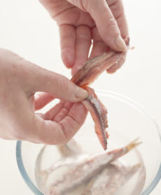 Dissalate le acciughe sotto acqua corrente e sfilettatele eliminando lische ed eventuali residui di interiora. Lasciate cadere gli scarti in un colino e mettete i 12 filetti ottenuti a bagno in acqua e aceto per 5 minuti. Sgocciolate i filetti, fateli asciugare su carta da cucina e irrorateli con poco olio extravergine e gocce di succo di limone. Lavate e asciugate le foglie di salvia. Disponete su metà di esse 1 filetto di acciuga, coprite con le foglie rimaste e compattate leggermente sandwich con le mani.
