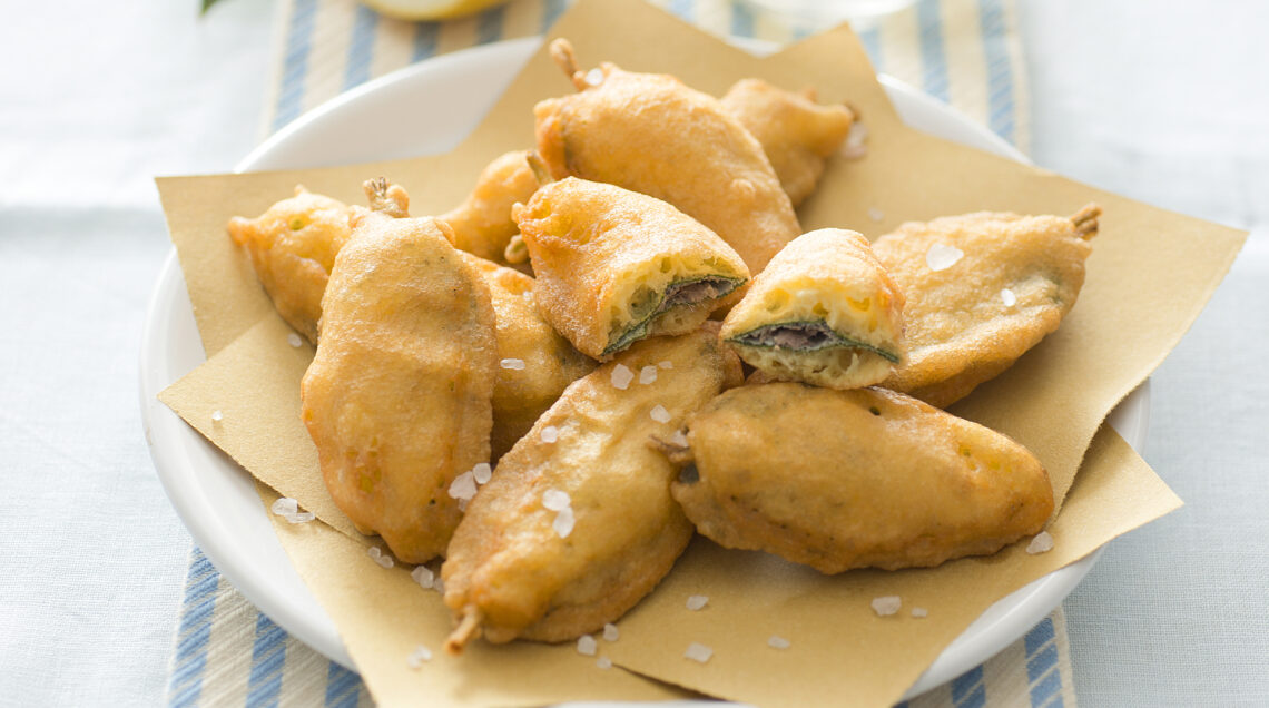 Pesce e foglie si immergono nella pastella e poi si tuffano nell'olio bene caldo. Bocconcini croccanti e saporiti per un antipasto sfizioso