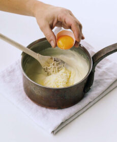 Togliete la besciamella dal fuoco, lasciatela intiepidire quindi incorporate prima il gruyère grattugiato, poi la panna e infine il tuorlo. Mescolate bene, coprite con pellicola a contatto (per evitare che in superficie si formi una pellicina in superficie) e lasciate raffreddare.