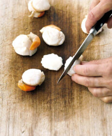 Portate a ebollizione in una casseruolina un litro di acqua con mezzo bicchiere di vino, sale, pepe, la carota e la cipolla a pezzetti e un ciuffetto di prezzemolo. Immergetevi i molluschi e scolateli dopo un paio di minuti. Dividete i coralli arancioni dalle noci bianche e affettate queste ultime.