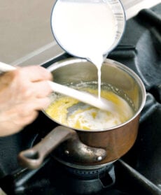 Preparate la salsa. Fate fondere 30 g di burro in una casseruolina a fondo spesso, incorporatevi la farina, tostatela,