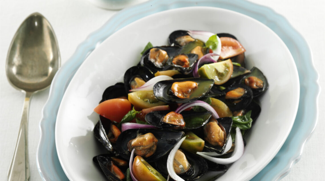 3) Ora lava i pomodori sardi, asciugali e tagliali a spicchi, poi sbuccia la cipolla e riducila a fettine. Dopodiché sfoglia, lava, asciuga e spezzetta il basilico, poi uniscilo ai pomodori e alle cipolle e utilizzalo per condire le cozze in un piatto da portata.