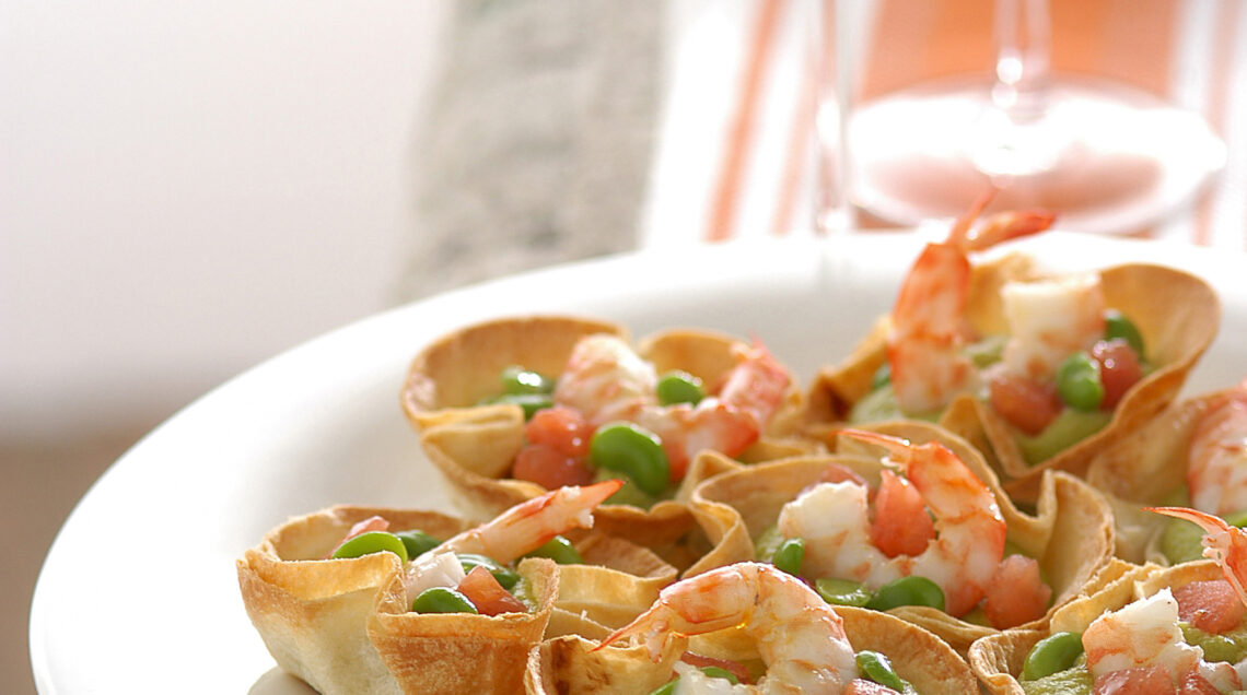Realizzati con le tortillas, ripieni con crema di fave, gamberi e pomodori, questi cestini diventano un antipasto sfizioso e raffinato. Potete sostituire le tortillas con pasta sfoglia o pasta brisée e le fave con piselli. Per rendere il ripieno cremoso, potete completare la preparazione con un ciuffo di maionese.