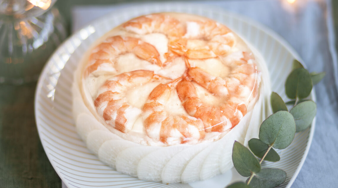Un antipasto raffinato e di grande effetto; il cuore dello sformato è un composto cremoso di mascarpone, panna, gamberi cotti nel court bouillon e scampi. Il tocco esotico arriva dalla corona di daikon, a sigillo di un piatto regale