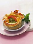 5) Disponi in 8 coppe individuali, sul genere di quelle di vetro della macedonia, una base di foglie di insalata, tutto l’ananas rimasto tagliato a dadini, i finocchi e i gamberi. Decora con i chicchi di melagrana rimasti e gli spicchi d’arancia, poi irrora il cocktail di gamberi e frutta con l’emulsione di frutta.