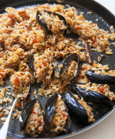 Le cozze ripiene di riso sono una preparazione tipica della gastronomia turca, conosciute con il nome di Midye dolma. Nella ricetta originale le cozze sono farcite con riso, uvetta, pinoli e molte spezie. Tra le tante varianti anche quella qui proposta con pomodoro e aneto e servita fredda con succo di limone. Le cozze ripiene sono servite come antipasto o come "meze” cioè i piatti serviti prima delle portate principale. Sono spesso proposte anche come street food.