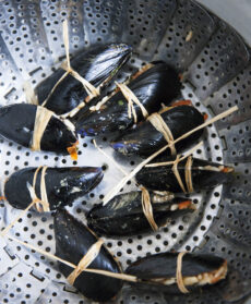 Aprite le cozze a crudo e riempitele con il riso, richiudetele e legatele con un filo di rafia, in modo che non si aprano, e cuocetele a vapore per circa 20 minuti.