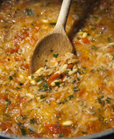 Sbucciate l'aglio e la cipolla, tritateli, trasferiteli in una padella con 2 cucchiai d'olio fateli soffriggere con i pinoli. Quando hanno preso colore, aggiungete i pomodori lavati e spezzettati grossolanamente, la cannella, i chiodi di garofano, il prezzemolo e l'aneto tritati, poi mescolate e lasciate cuocere per 4-5 minuti. Unite il riso, salate e pepate, quindi aggiungete acqua in quantità doppia rispetto al volume del riso e lasciate cuocere a pentola coperta per circa 10 minuti. Quando tutta l'acqua è stata assorbita, spegnete e fate raffreddare.