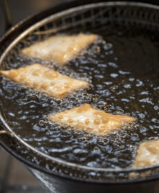 Usate olio di semi ben caldo, aromatizzato a piacere anche con uno spicchio di aglio e in rametto di rosmarino, timo o salvia. Friggete pochi pezzi per volta in un tegame alto e stretto per pochi minuti, finché le donzelline sono ben dorate. Se avete lavorato a lungo l'impasto e avete tirato la pasta il più sottile possibile in modo che resti morbida ed elastica, le donzelline risultano gonfie e vuote all'interno.