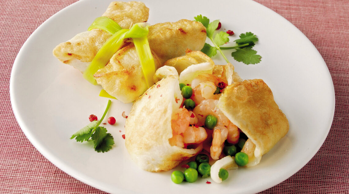 3) Fai i fagottini e friggi. Taglia il porro a listarelle e scalda abbondante olio per friggere in una padella dal fondo spesso e i bordi alti. Distribuisci sulle crespelle la farcitura di gamberi e piselli, piega verso il centro i lembi laterali delle crespelle, arrotolale a involtino e legale con le listarelle di porro. Friggi i fagottini ai gamberi nell'olio caldo per pochi minuti, scolali dorati su entrambi i lati, asciugali su carta assorbente per eliminare l'unto in eccesso e servili subito caldi.