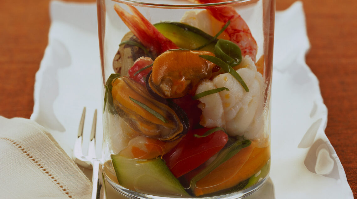 2) Disponi verdure e pesci in 4 bicchieri. Condisci con scalogno, basilico, sale, pepe e versa il brodo. Cuoci l'insalata di mare nel bicchiere nel microonde a 800 W per 4 minuti.