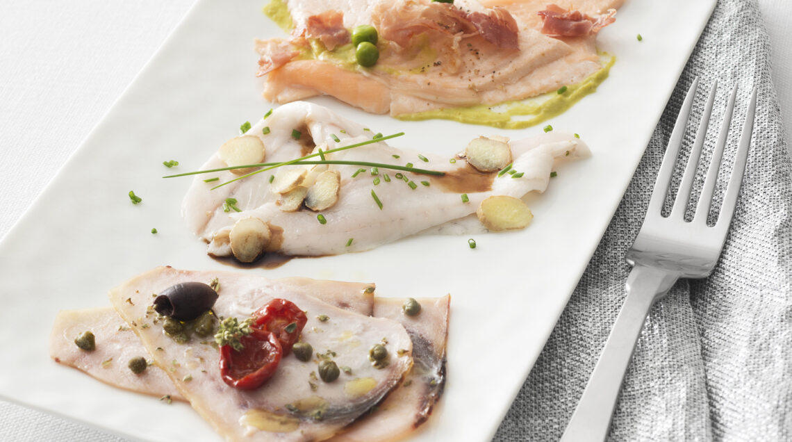 Salmone, branzino e pesce spada, un trio freschissimo, condito con ingredienti semplici per preservare il sapore naturale del pesce. Un antipasto semplice e chic, perfetto anche come secondo leggero