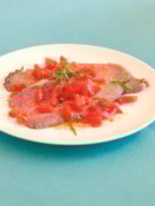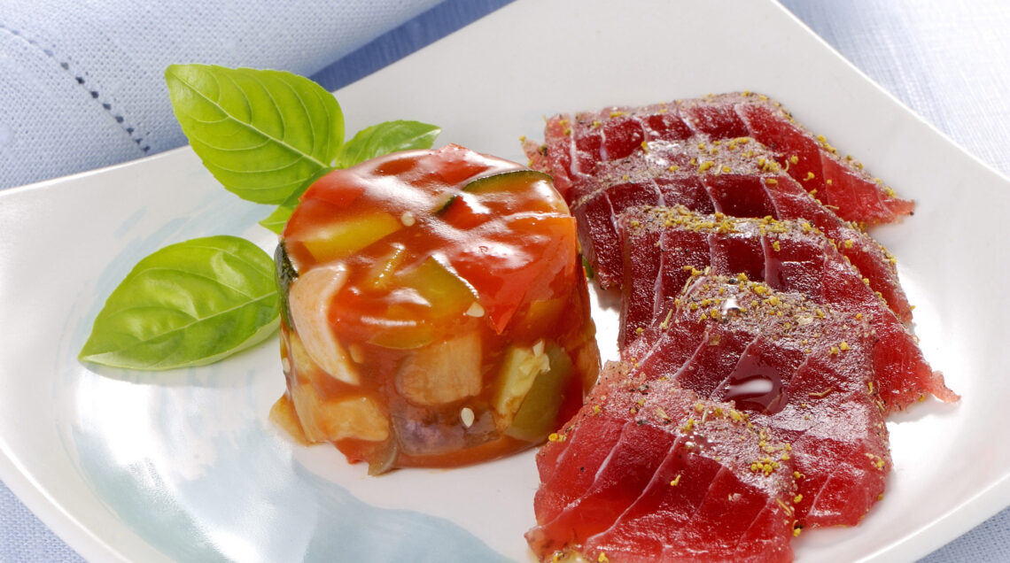 3) Sforma le terrine di ratatouille sui piatti individuali e servile con le fettine di tonno, infine guarnisci con qualche foglia di basilico. "