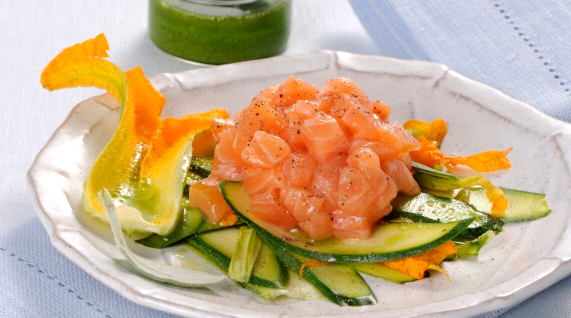 Semplice da realizzare e molto gradevole, la tartare di salmone si completa nella nostra ricetta con un carpaccio di zucchine, composto da nastri sottilissimi mescolati con i loro fiori, a listarelle. Condisce il tutto un profumatissimo olio alla salvia. Per il consumo a crudo, il pesce deve essere abbattuto, ovvero tenuto 96 ore in freezer, poi scongelato in frigo: se lo tagliate quando non è ancora del tutto scongelato otterrete dadini più regolari.