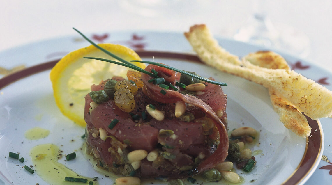 2) Lasciane da parte alcuni per la decorazione della tartare al tonno. Trita tutti gli altri pinoli con il mixer, insieme alle acciughe dissalate spezzettate, i capperi dissalati, l’uvetta e metà dell’erba cipollina lavata, asciugata e sforbiciata. Bagna il composto con il succo dei limoni e 3 cucchiai di olio.