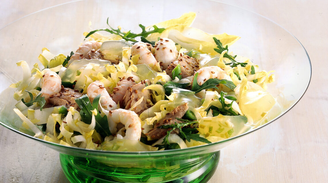 3 Nel frattempo lessate gli scampi in acqua bollente salata per 5 minuti, scolateli e sgusciateli. Spuntate i fagiolini, lessateli in acqua bollente salata e scolateli al dente. Tagliate a listarelle l'insalata belga e la rucola.