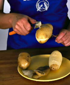 Fai cuocere 300 g di patate in acqua bollente salata, sbucciale e passale ancora calde allo schiacciapatate.
