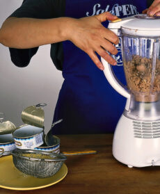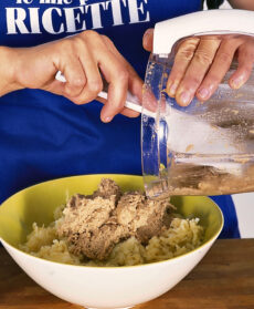 Frulla 150 g di tonno con 2 filetti di acciughe e 2 cetriolini spezzettati, fino a ottenere un composto abbastanza omogeneo.