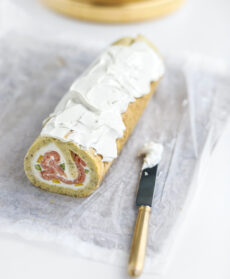 Preparate il bisquit, separate i tuorli e gli albumi e teneteli da parte. Foderate una teglia da 25 x 32 cm con un foglio di carta da forno e imburratelo. In una ciotola, mescolate i tuorli con il burro fuso, unite la senape, l'aneto, sale e pepe; amalgamate gli ingredienti e aggiungete la farina, mescolando molto bene. Montate a neve gli albumi e uniteli al composto. Versate l'impasto nella teglia, livellatelo e infornate per 10 minuti a 200°. Poi, capovolgete il bisquit su un foglio di carta da forno, staccate la carta di cottura, arrotolatelo delicatamente e lasciatelo raffreddare.