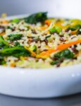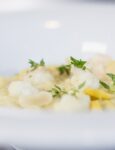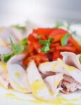 3 Miscelate lo yogurt con il succo del limone, la sua scorza grattugiata, lo zenzero spellato e grattugiato, un filo di olio extravergine, sale e pepe. Sminuzzate la menta e aggiungetela allo yogurt.